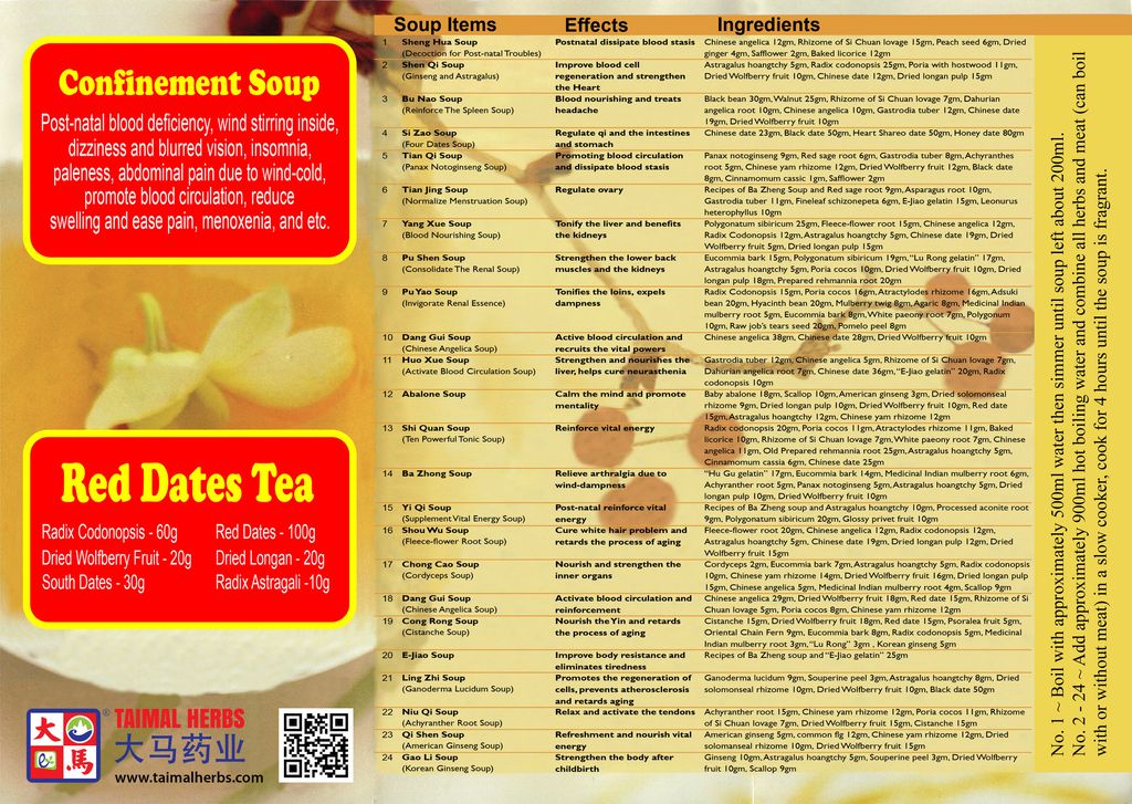 During the confinement period, it is advised to consume confinement tea and soup. It helps nourish the body, repair the uterus, replenish energy levels and promote overall health in mothers. This practice is believed to help speed up their childbirth recovery.